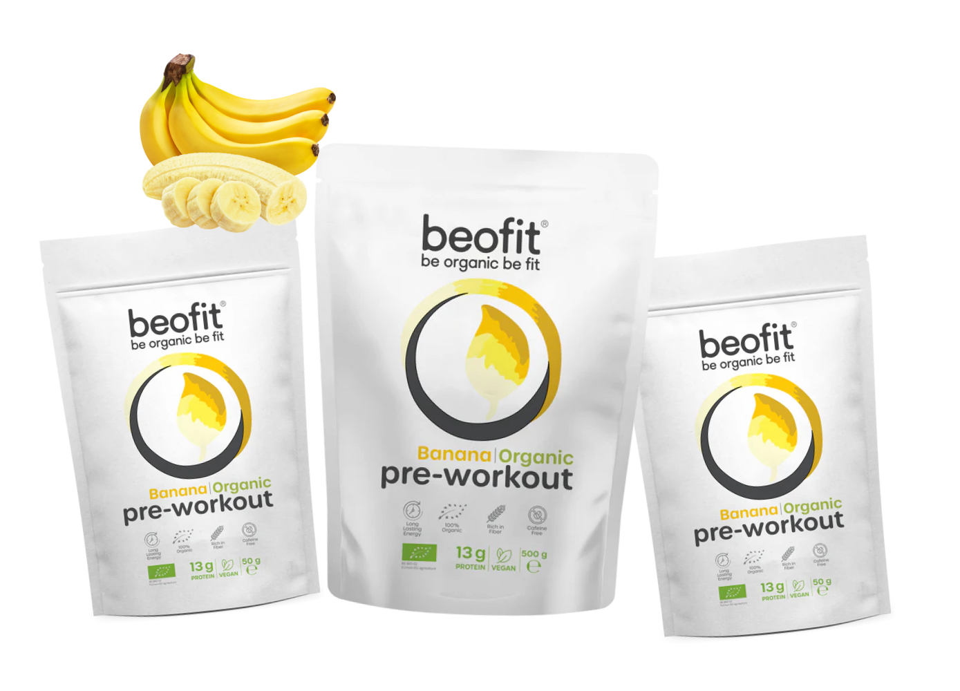 Bestel nu je 100% biologische Beofit banana pre-workout shake.