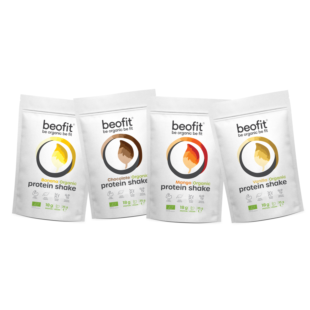 Wil je onze biologische proteïneshakes uitproberen? Het Beofit proefpakket biedt vier zakjes (35g) met verschillende smaken: vanille, chocolade, mango en banaan. Deze shakes zijn 100% natuurlijk, vegan en rijk aan plantaardige eiwitten, perfect voor spierherstel en -opbouw. Ontdek jouw favoriete smaak en ervaar de kwaliteit van pure, biologische proteïne. Ideaal voor onderweg, op het werk of om kennis te maken met onze producten.